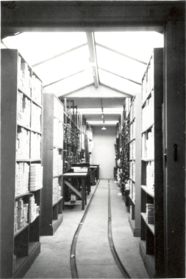 It contained a few 1930s photos that had escaped the dust and debris of the war. Imagine my surprise when I saw these bookshelves. Here was the room I had conjured, with the addition of the trolley tracks for carrying the heavy volumes to the proper locations.